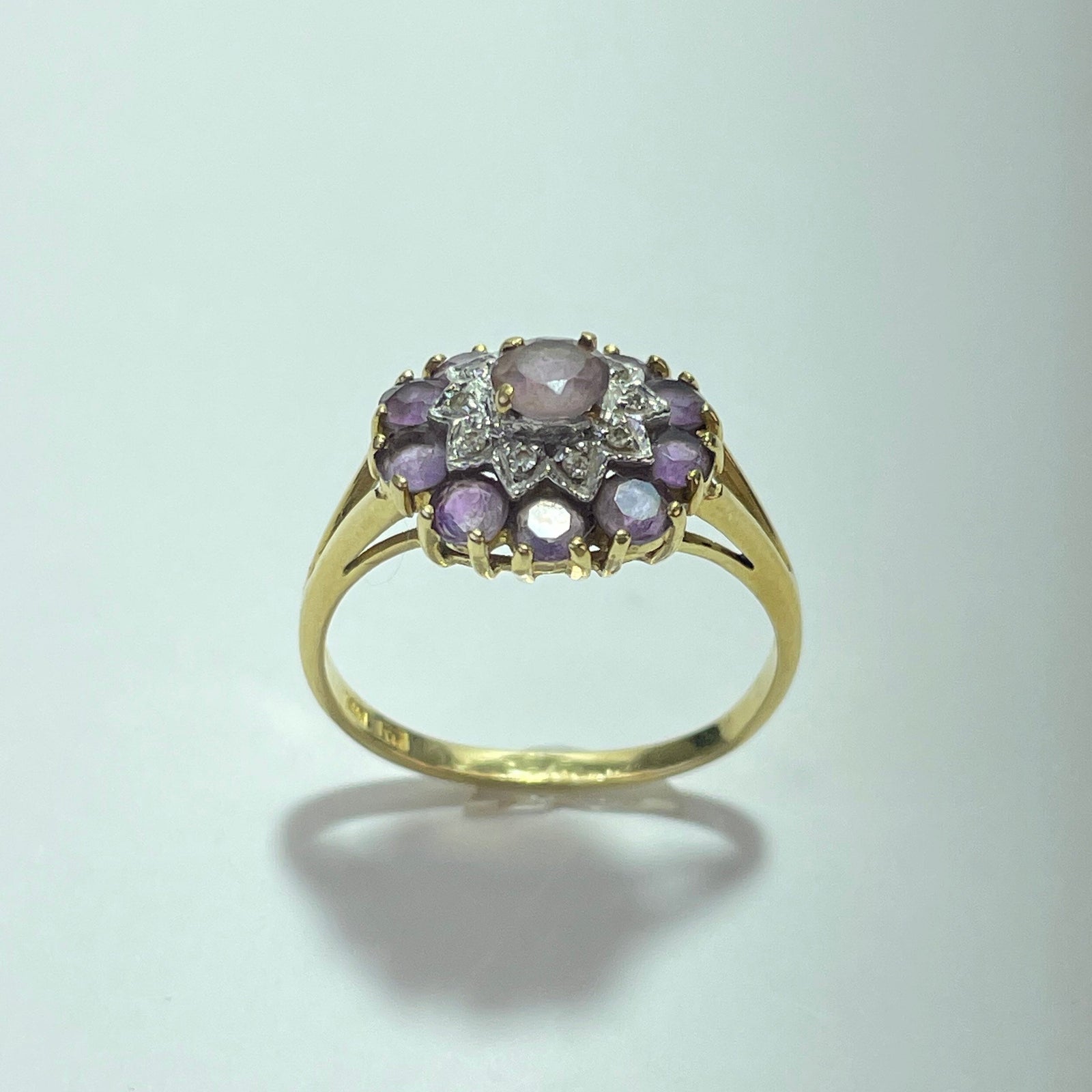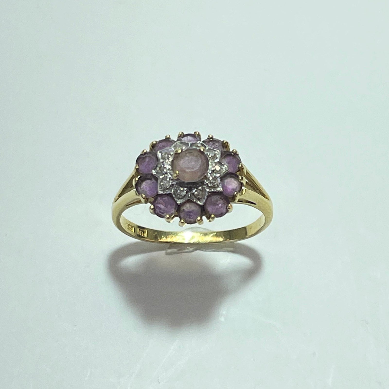 Affirmez votre élégance avec cette ravissante bague en or jaune 18 carats (750/1000), ornée d’une améthyste centrale entourée d’un halo de pierres violettes. Son sertissage délicat forme une composition florale lumineuse, sublimée par l’éclat chaleureux de l’or jaune.