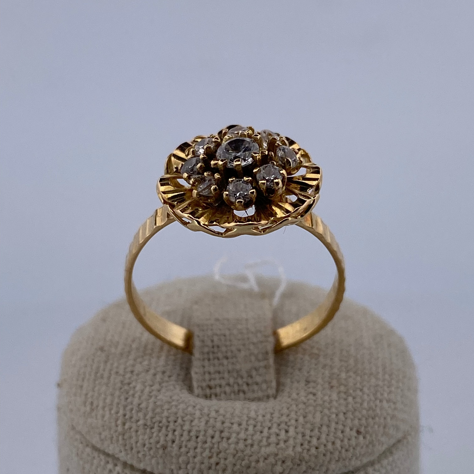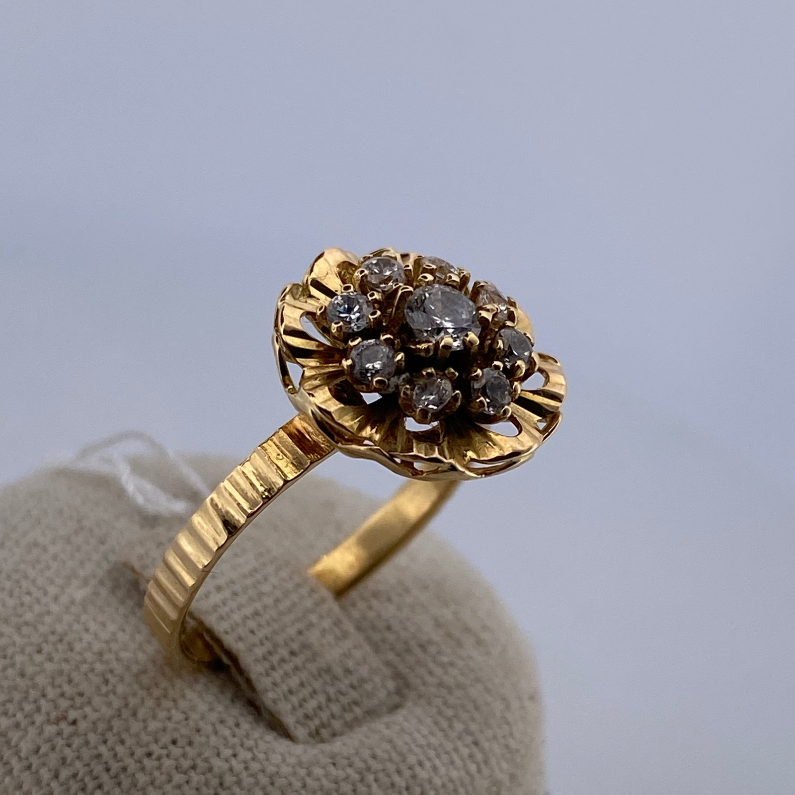 Une bague élégante en or jaune 18 carats (750/1000), d’un poids de 3,13 g, au design floral raffiné. Sertie d’une pierre centrale entourée de plusieurs pierres scintillantes, elle séduit par son éclat et son allure intemporelle.