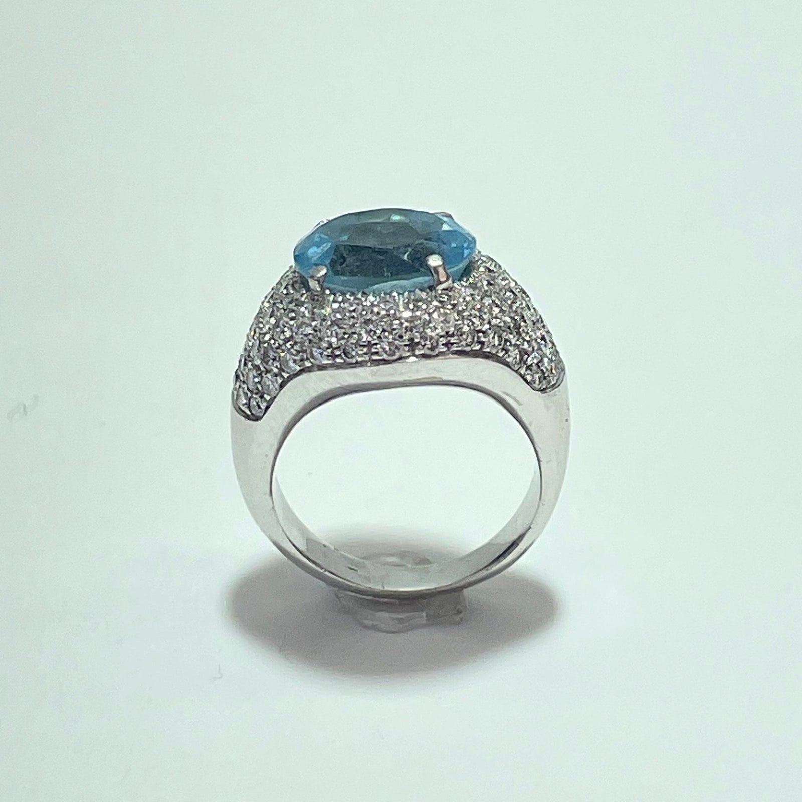 Cette bague majestueuse en or blanc 18 carats (750/1000) associe la profondeur d’une aigue-marine bleue taille ovale à l’éclat étincelant de 80 diamants totalisant 1,6 carats. Avec ses 12,8 g, elle se distingue par sa prestance et son raffinement, incarnant l’élégance de la haute joaillerie.