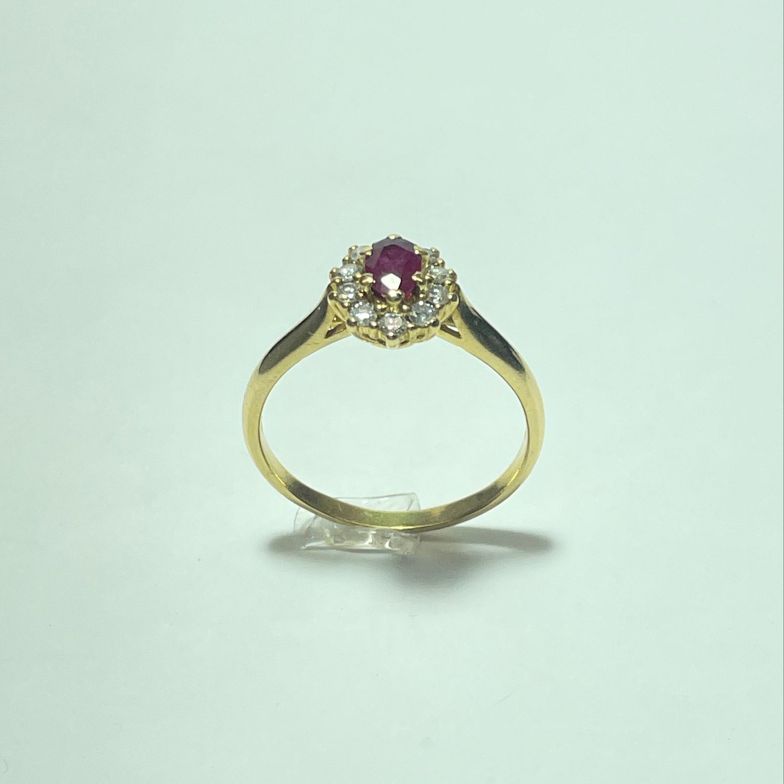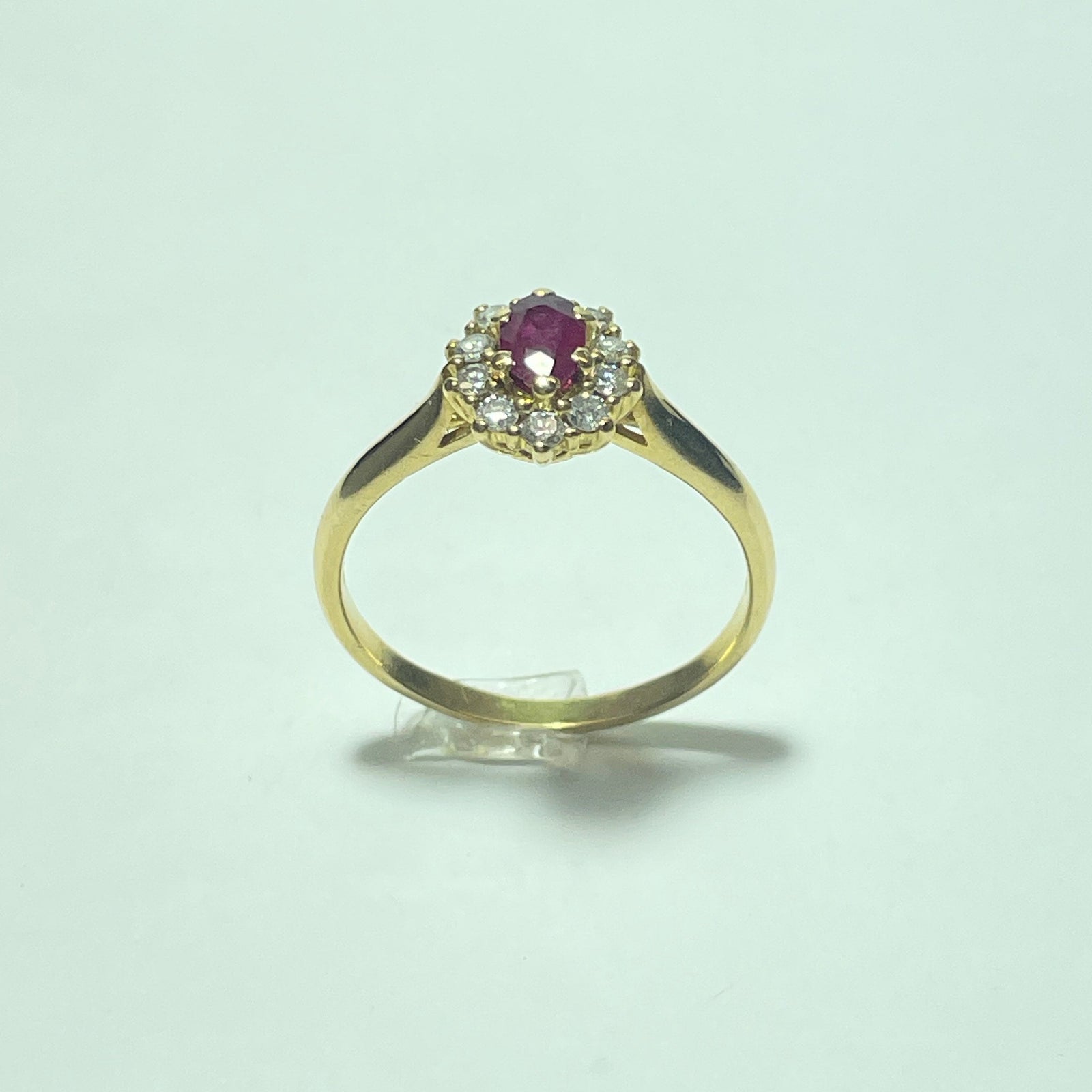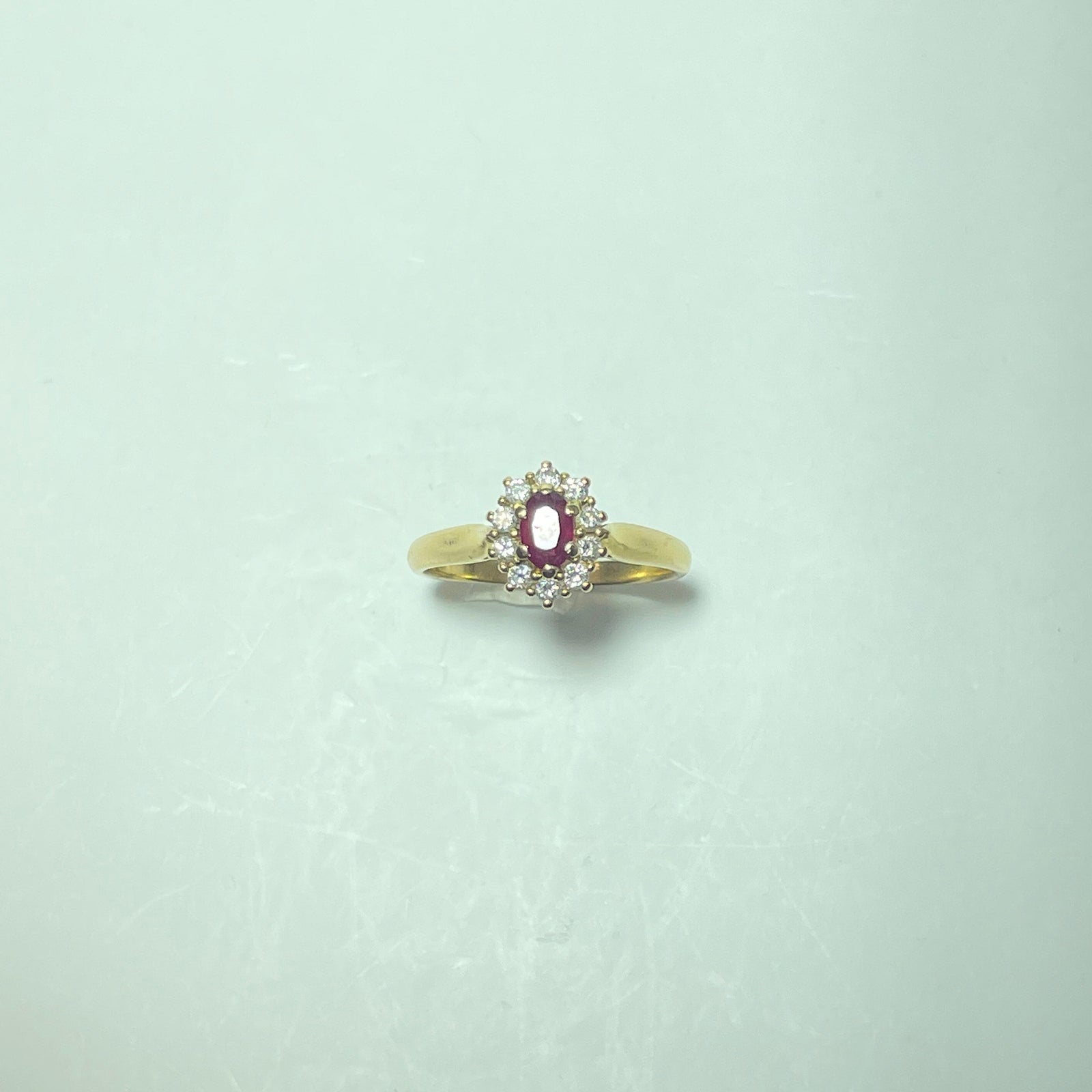 Cette bague marguerite en or jaune 18 carats (750/1000) est une pièce emblématique de la joaillerie classique. Elle se distingue par un rubis central à la couleur rouge profonde, symbole de passion et d’élégance, sublimé par un entourage de diamants soigneusement sertis, formant le célèbre motif marguerite.