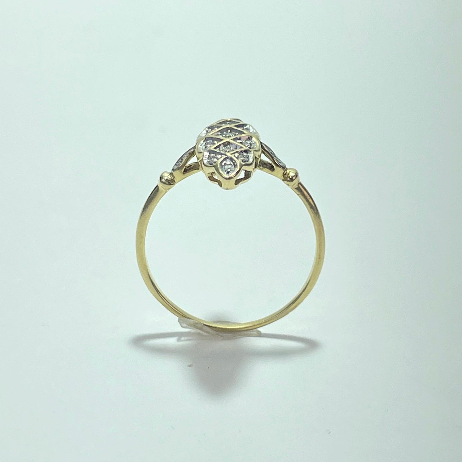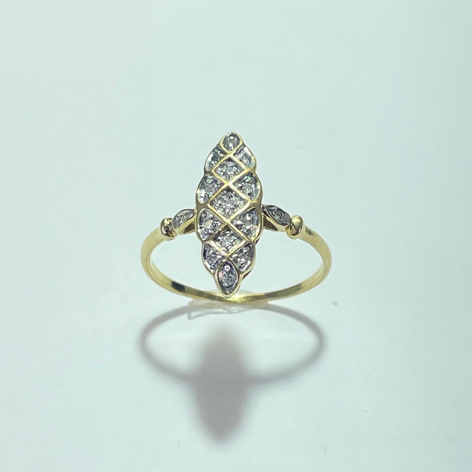 Affirmez votre élégance avec cette superbe bague marquise en or jaune 18 carats (750/1000), sertie de 13 diamants étincelants totalisant 0,13 carat. Sa monture ajourée et son pavage raffiné dessinent un motif délicat et lumineux, emblématique du style vintage français.