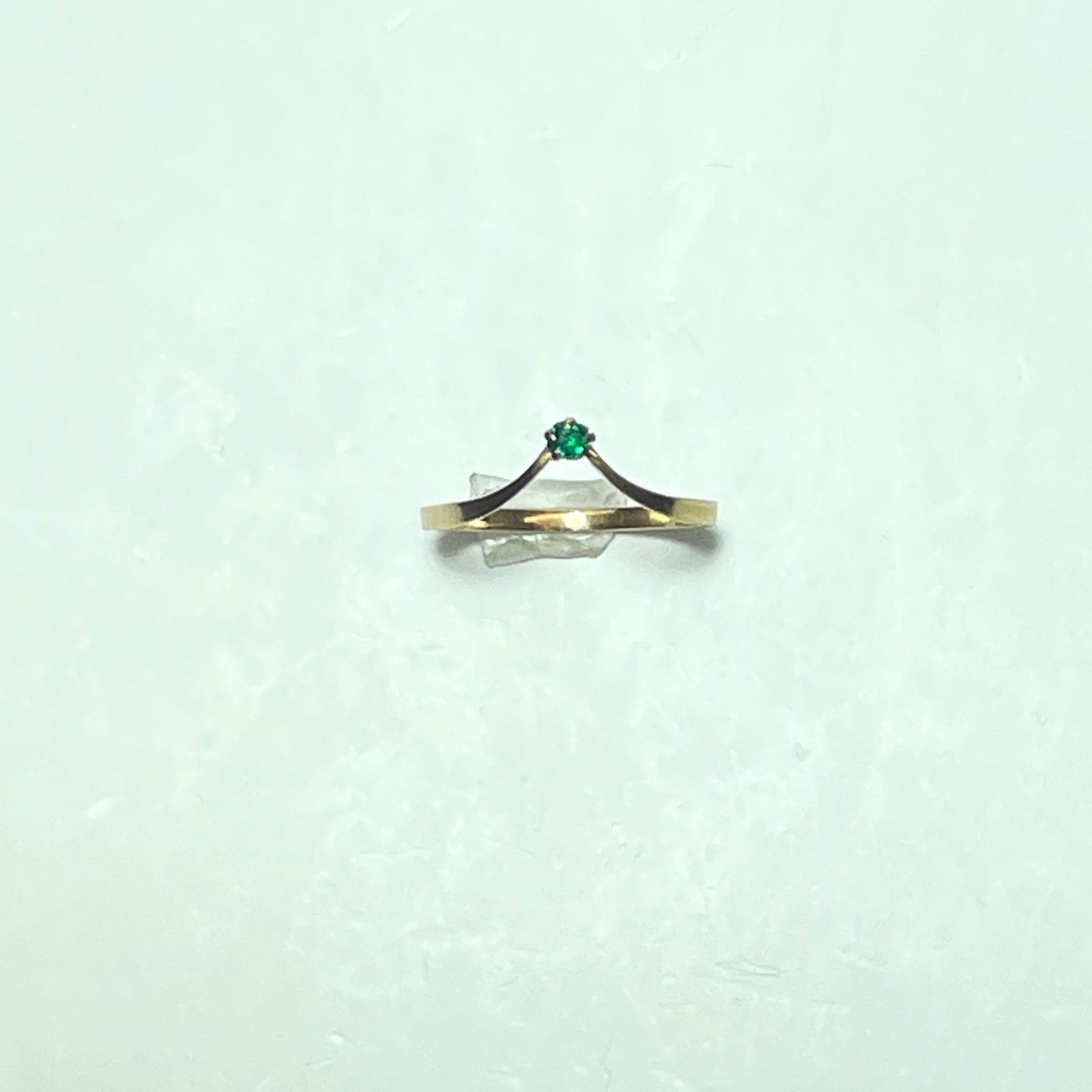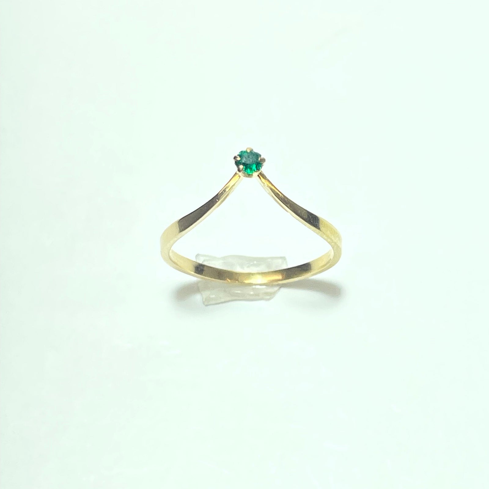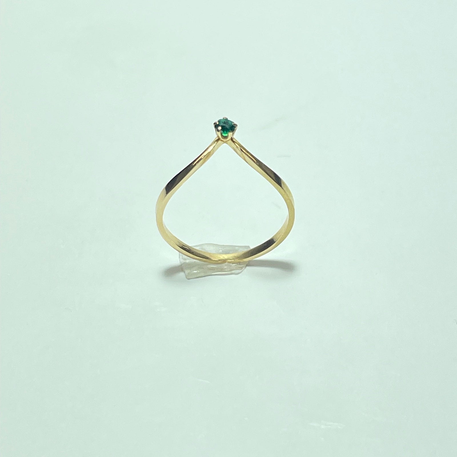 La monture présente une forme épurée et élancée, avec un anneau fin en or jaune poli qui se resserre subtilement vers le sommet pour accueillir une petite pierre verte, maintenue par un sertissage discret à griffes.