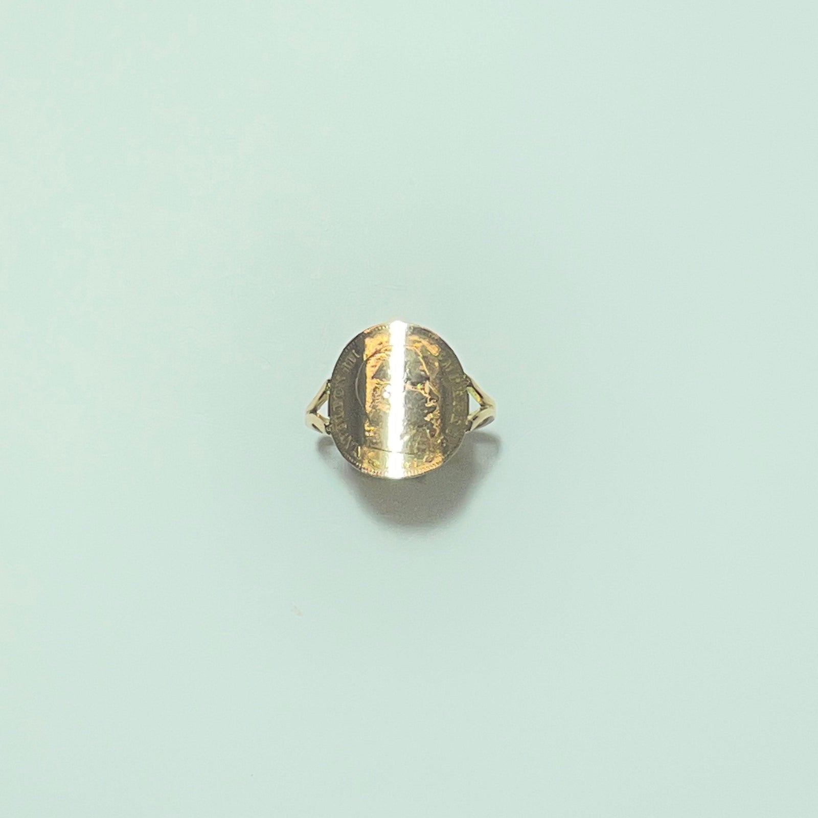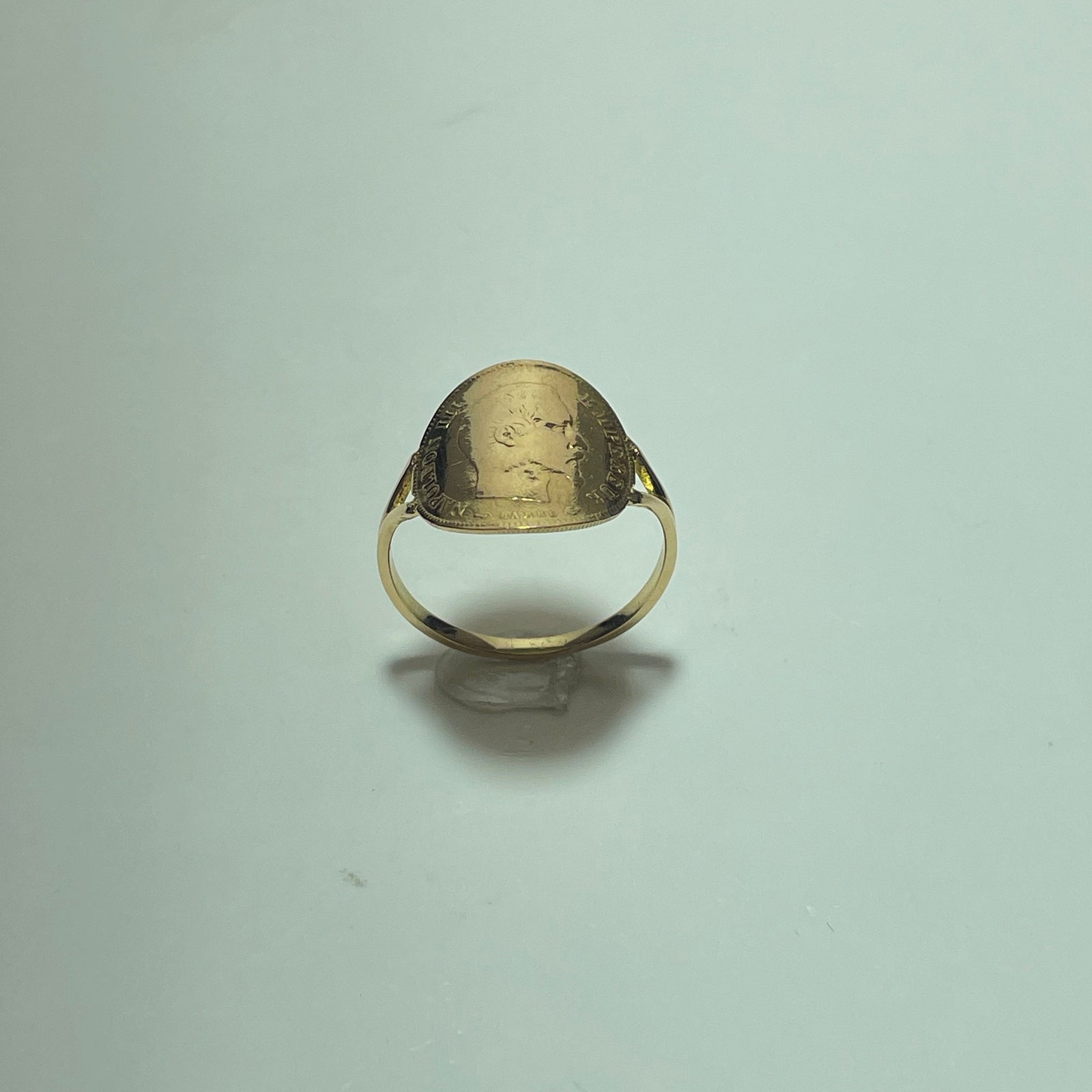 La pièce d’or de 10 Francs, finement visible sur le plateau de la bague, apporte une dimension historique et symbolique forte. Ses reliefs, volontairement conservés, témoignent de son authenticité et de son vécu.