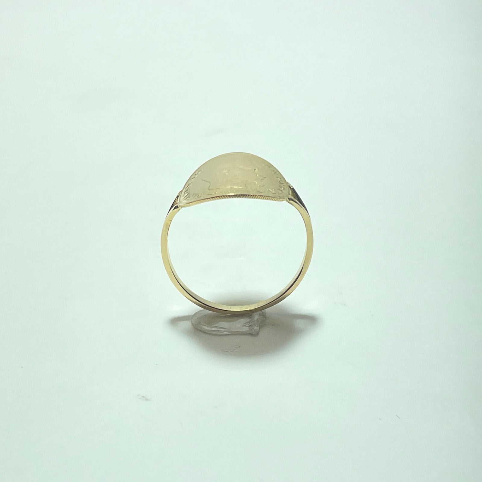 La monture, entièrement réalisée en or jaune 18 carats, présente une forme de chevalière élégante et équilibrée, pensée pour mettre en valeur la pièce centrale sans excès.