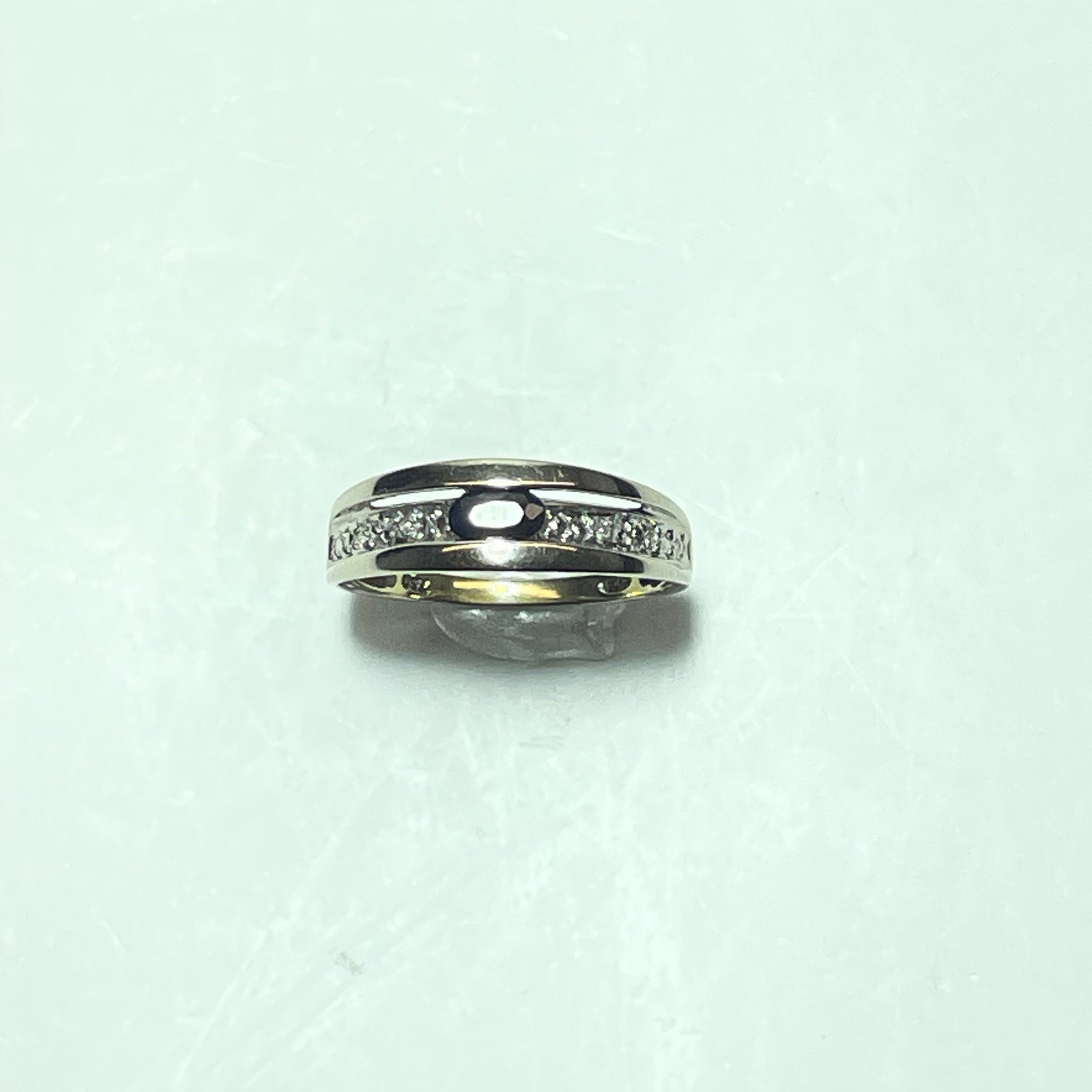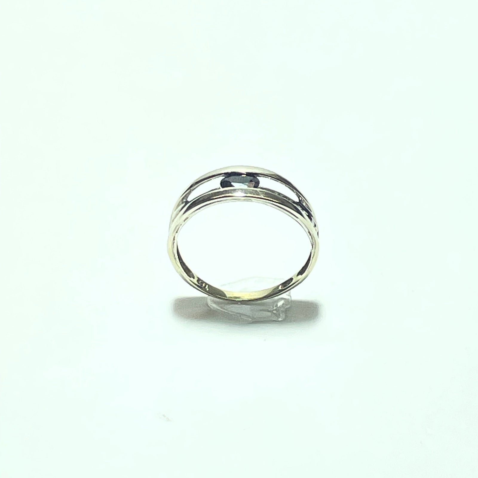 De part et d’autre de la pierre centrale, de petites pierres claires viennent apporter une touche de lumière supplémentaire, créant un contraste élégant avec la teinte profonde de la pierre bleue. L’ensemble offre un rendu équilibré, discret mais sophistiqué.