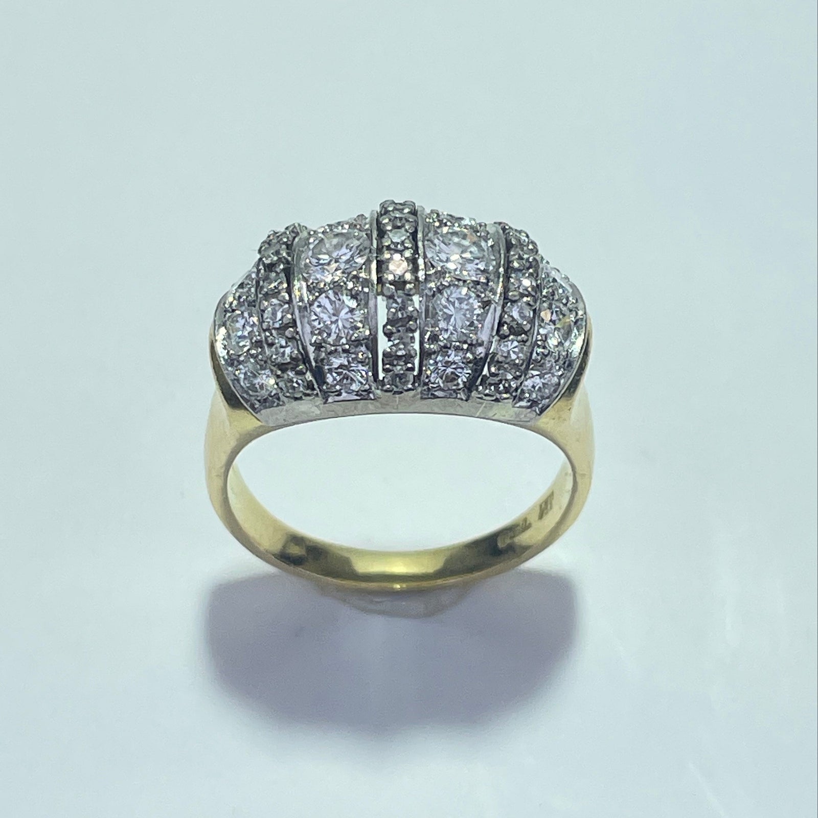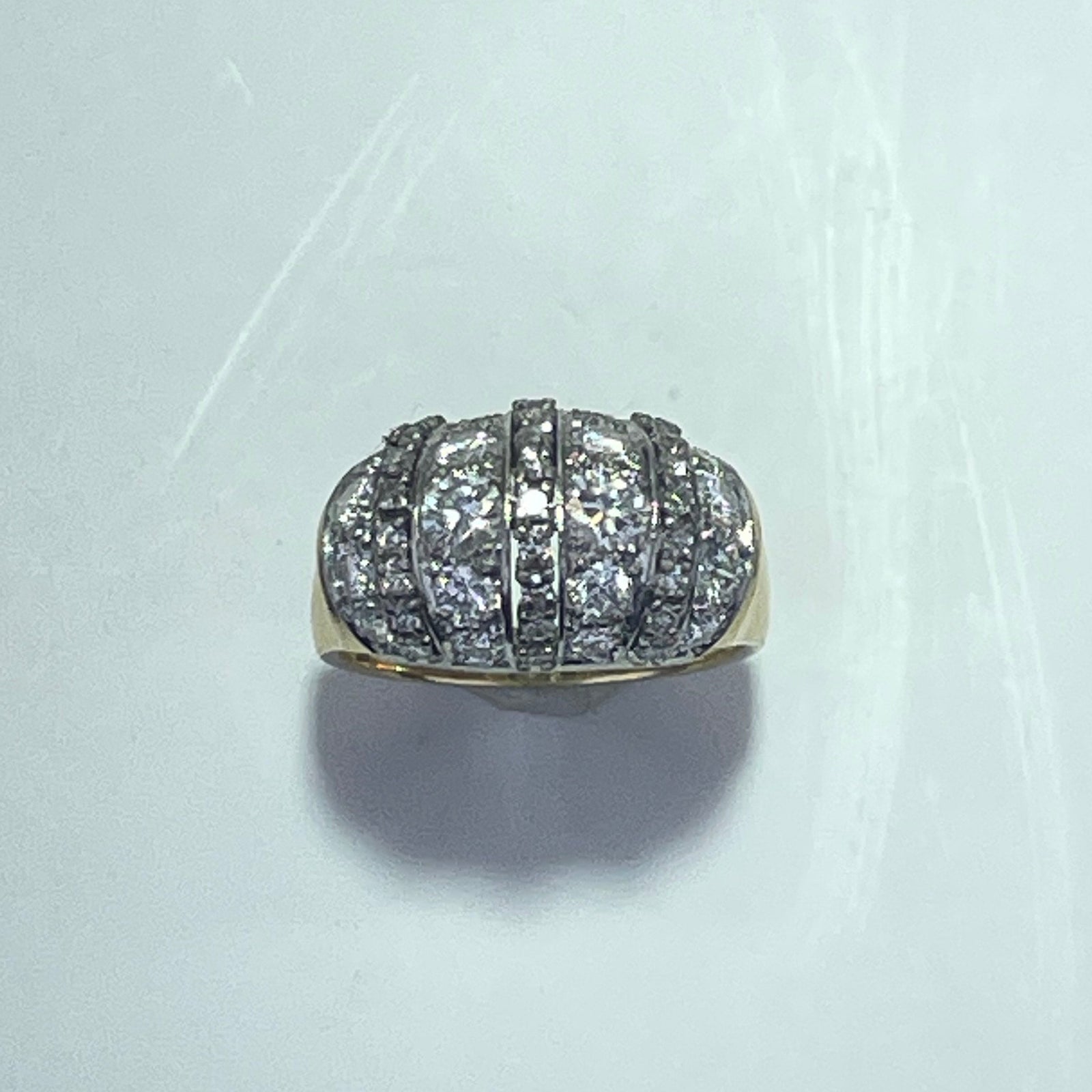 Affirmez votre éclat avec cette somptueuse bague en or jaune 18 carats (750/1000), sertie de 43 diamants pour un total de 2,67 carats. Son pavage exceptionnel, réparti sur plusieurs rangs, capte la lumière sous tous les angles et crée un effet scintillant d’une intensité rare.