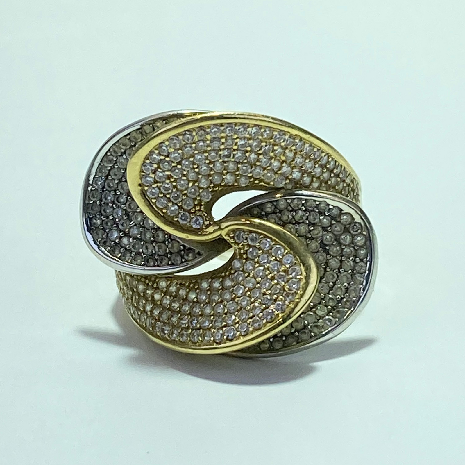 Affirmez votre style avec cette somptueuse bague en or jaune 18 carats (750/1000), au design contemporain et sculptural. Ses courbes entrelacées sont pavées de pierres scintillantes, captant la lumière sous tous les angles pour un effet éclatant et raffiné. Véritable pièce de caractère, elle allie audace et élégance avec une maîtrise joaillière remarquable.