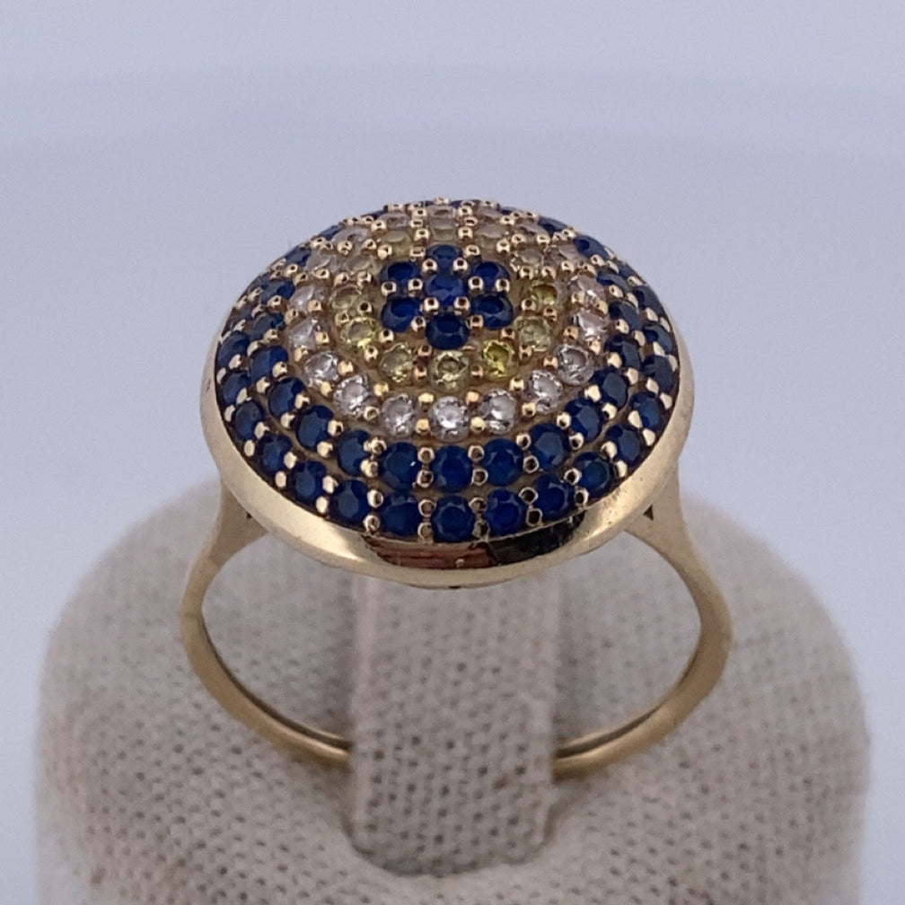 Une bague originale en or jaune 9 carats (375/1000), d’un poids de 3,32 g, sertie de multiples pierres aux couleurs vives : bleu profond, jaune lumineux et blanc éclatant. Son design circulaire travaillé en mosaïque lui confère une allure moderne et élégante.