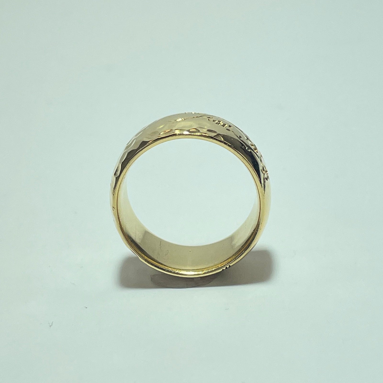 Une bague vintage imposante et élégante, conçue en or jaune 18 carats (750/1000), avec un poids de 14,51 g qui témoigne de sa solidité et de sa prestance. Son anneau large est finement orné de gravures délicates, offrant une touche artisanale et raffinée qui fait de cette pièce un bijou d’exception.