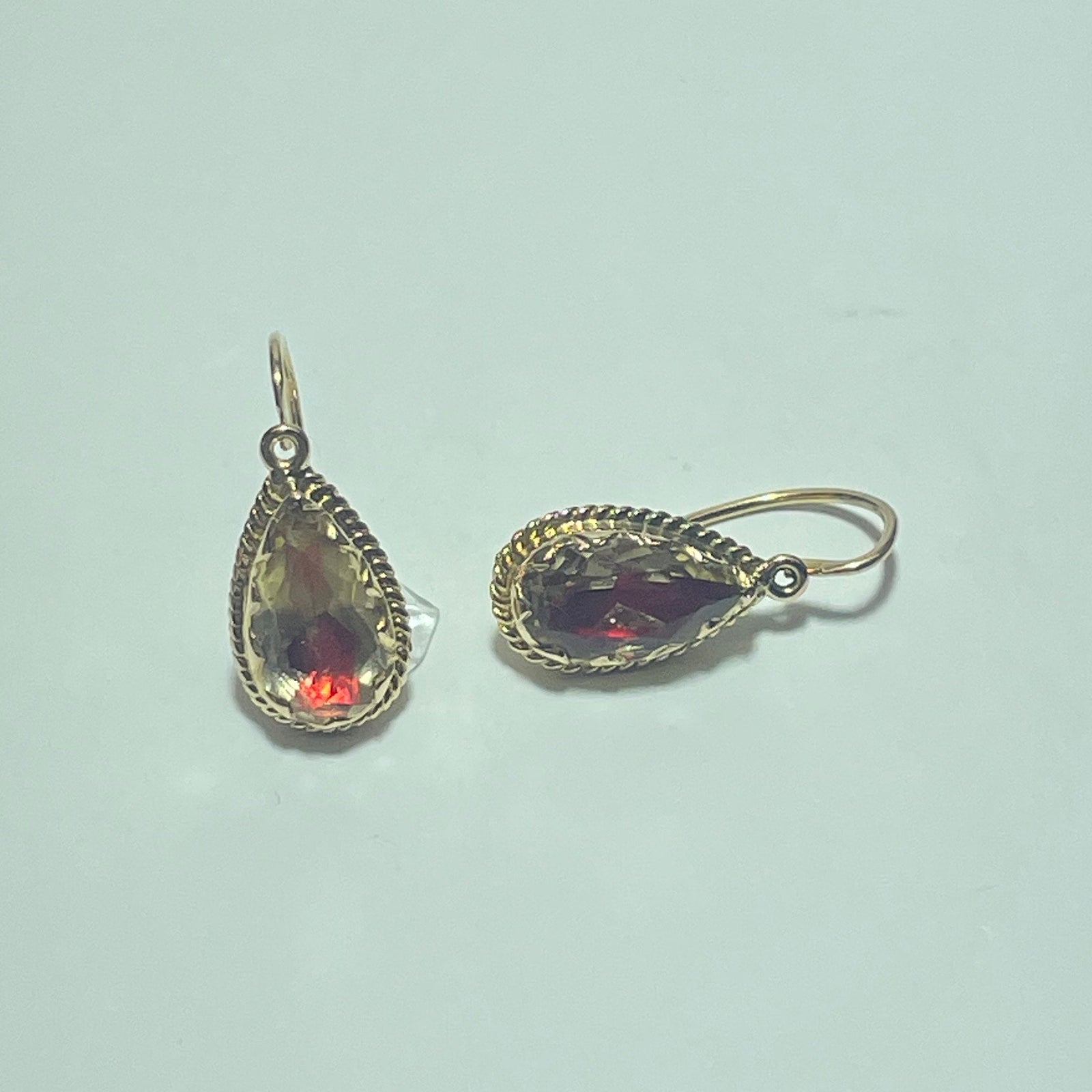 Sublimez votre allure avec ces boucles d’oreilles en or jaune 18 carats (750/1000), au design poire raffiné. Chaque boucle abrite une pierre facettée aux reflets rouge profond, mise en valeur par un serti torsadé qui lui donne une touche vintage élégante et chaleureuse.
