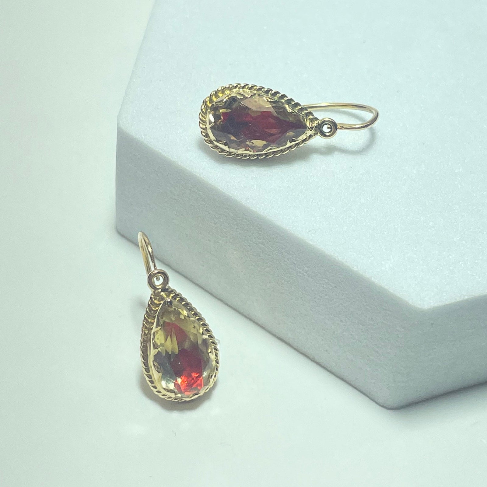 Ces boucles d’oreilles allient intensité de couleur et charme vintage. Le rouge profond des pierres apporte une touche élégante et chaleureuse, tandis que leur forme poire allonge subtilement le port de tête. Un bijou intemporel, parfait pour les occasions spéciales comme pour sublimer une tenue quotidienne.