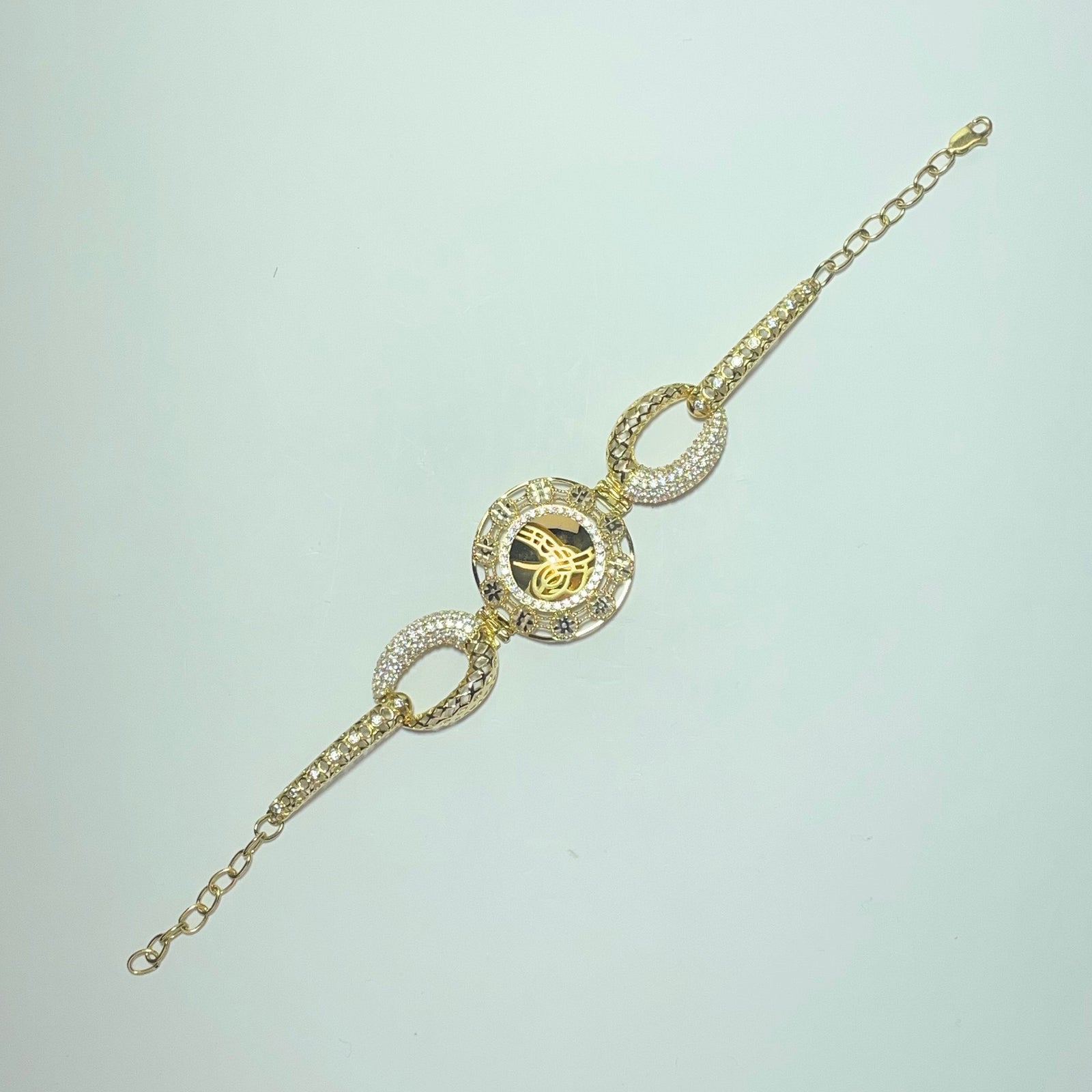 Pièce d’exception mêlant raffinement joaillier et héritage culturel, ce bracelet en or jaune 14 carats (585/1000) se distingue par son motif central orné d’une calligraphie arabe finement travaillée, sublimée par un entourage scintillant aux détails ciselés.