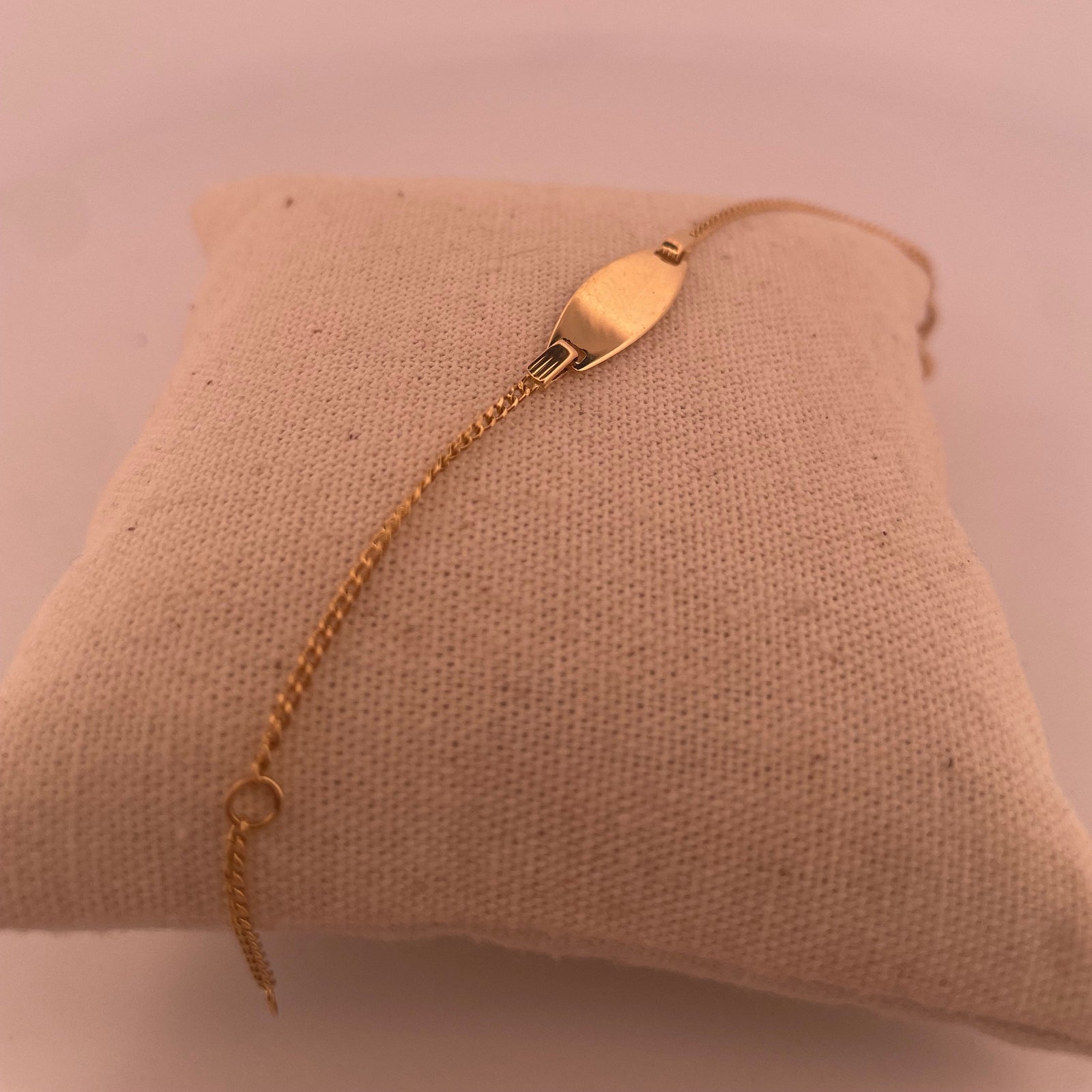 Un bracelet fin et raffiné en or jaune 18 carats (750/1000), d’un poids de 1,78 g et d’une longueur de 14 cm. Il est orné d’une petite plaque centrale lisse, pouvant être personnalisée par une gravure discrète, ce qui en fait un bijou idéal à offrir.