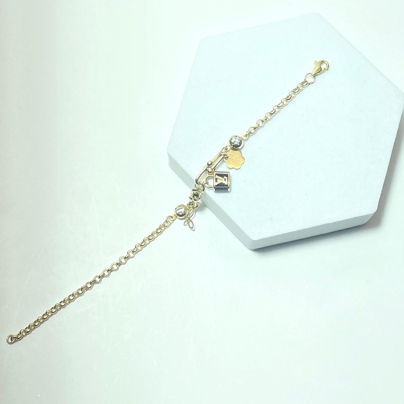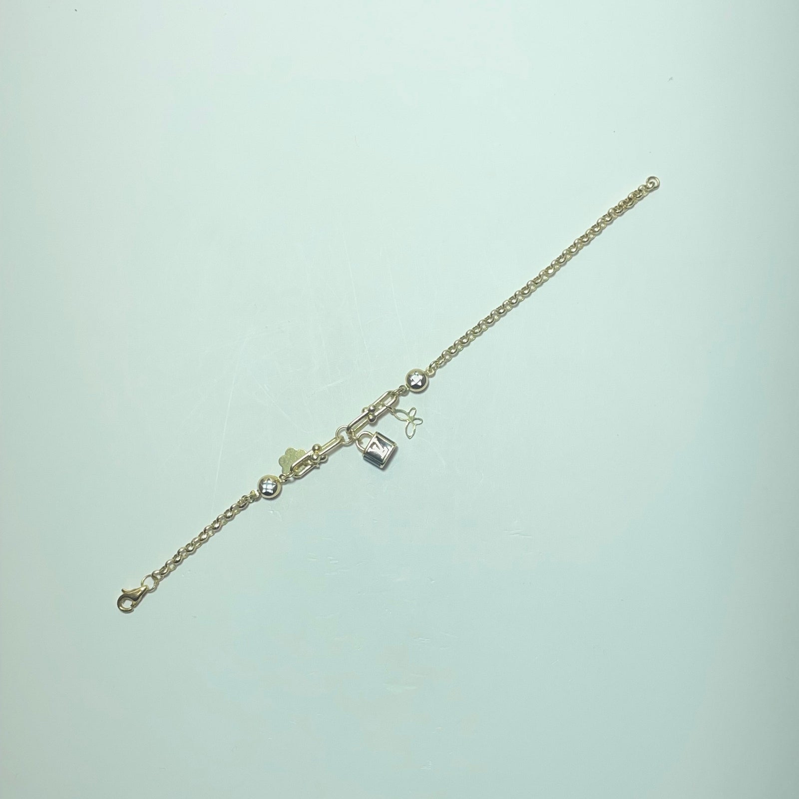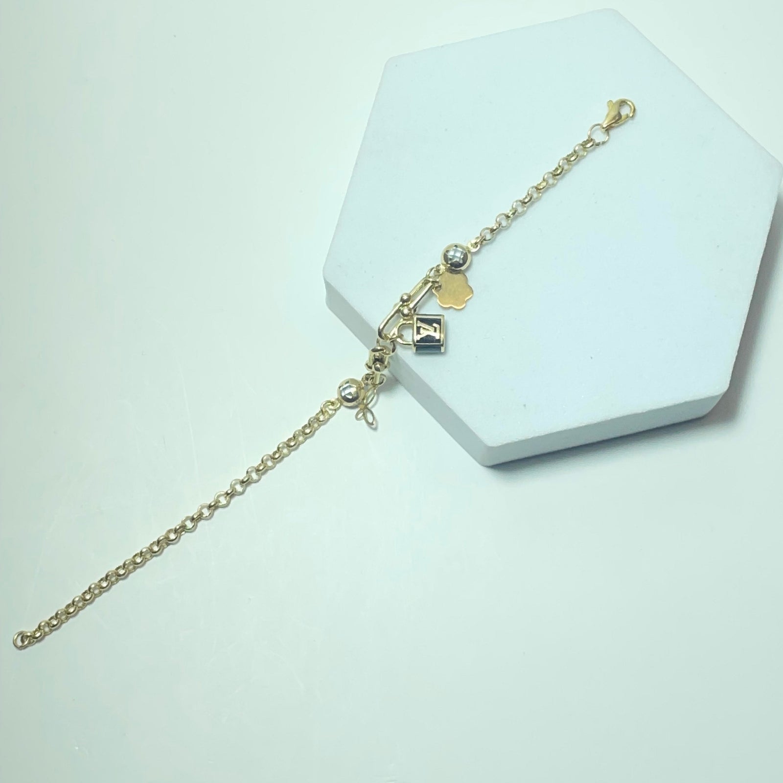 Raffiné et féminin, ce bracelet en or jaune 14 carats (585/1000) séduit par son design délicat et moderne, enrichi de petits éléments décoratifs suspendus qui apportent mouvement et élégance au poignet. Sa chaîne fine offre un rendu léger et harmonieux, idéal pour un port quotidien comme pour une occasion spéciale.