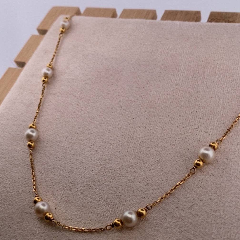 Sophistiqué et intemporel, ce collier en or jaune 18 carats (750/1000) associe l’éclat chaud de l’or à la douceur lumineuse des perles blanches. Ses maillons délicats sont rythmés par des alternances harmonieuses de perles et de petites boules en or poli, créant un équilibre parfait entre élégance et raffinement.
