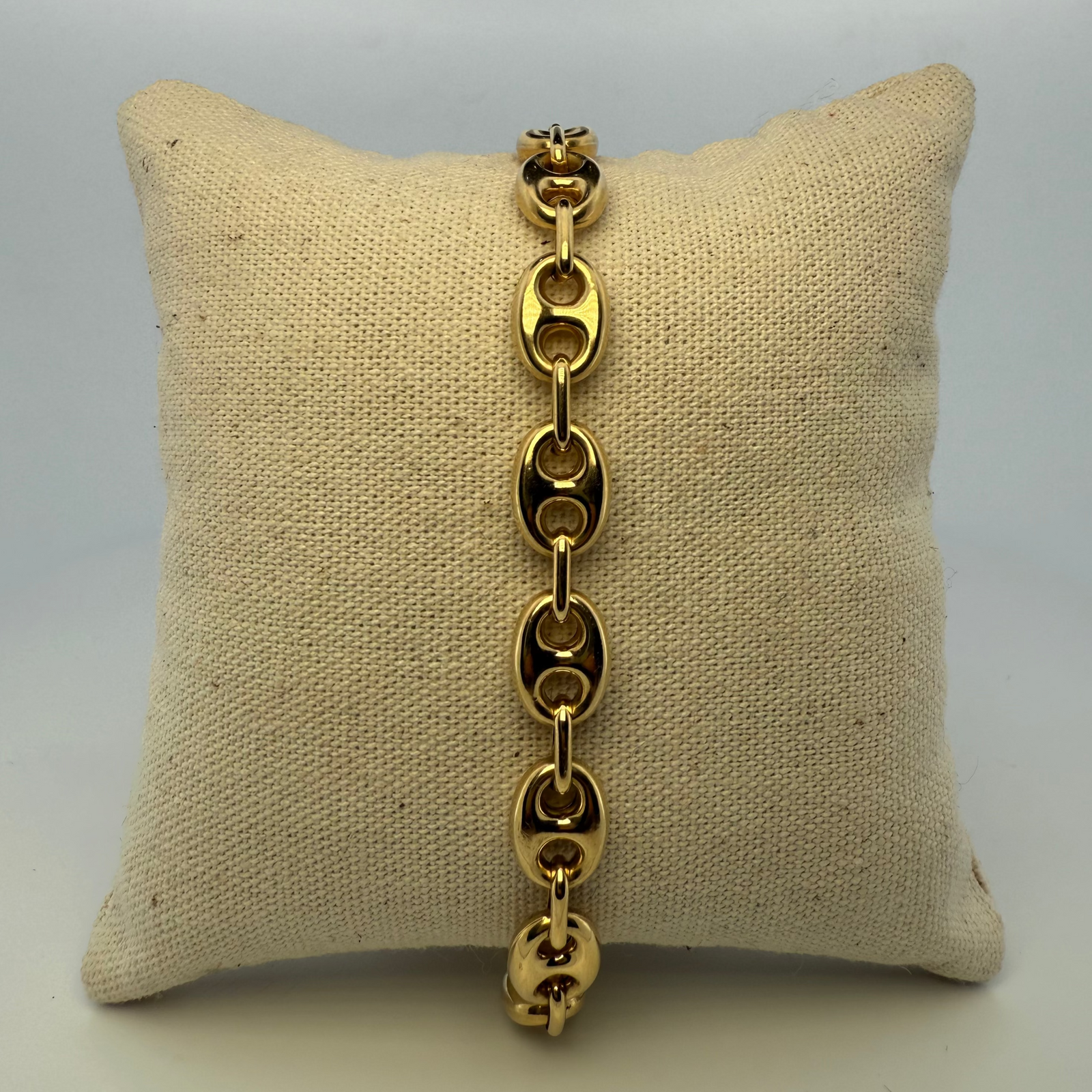 Un duo d’exception composé d’un collier et d’un bracelet assortis en or jaune 18 carats (750/1000). Le maillage épais et luxueux de ces pièces offre une allure puissante et élégante, idéale pour affirmer votre style avec distinction.
