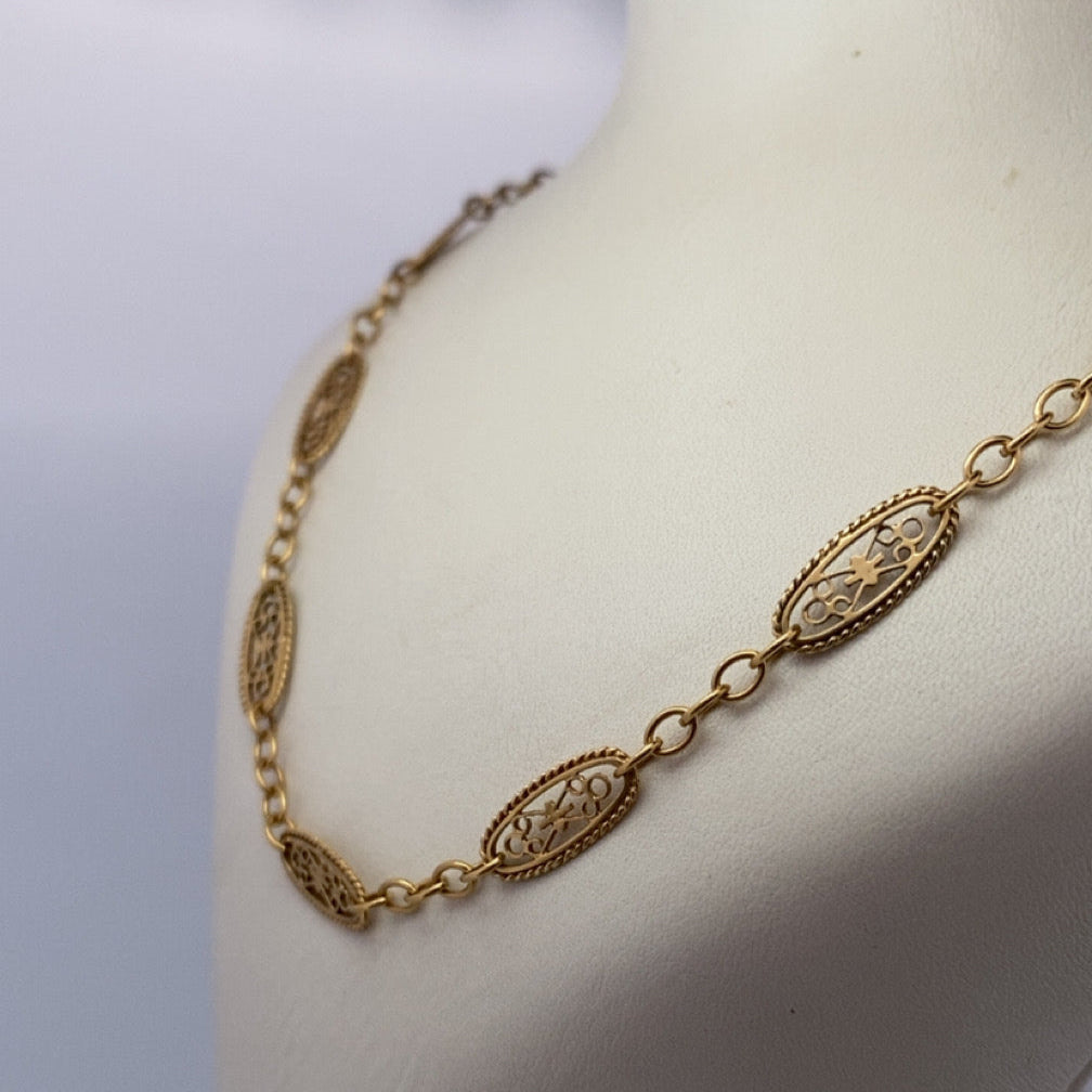 Un collier d’exception en or jaune 18 carats (750/1000), travaillé en filigrane artisanal. Les maillons ovales finement ajourés, ornés de motifs étoilés et arabesques, reflètent un savoir-faire traditionnel et intemporel.