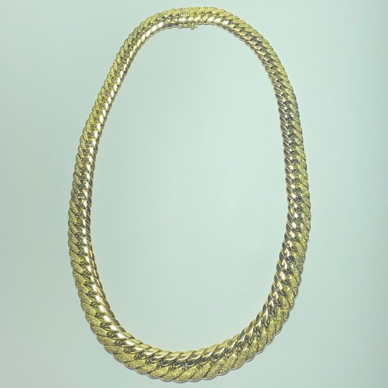 Imposant, raffiné et résolument luxueux, ce collier en or jaune 18 carats (750/1000) se distingue par sa maille anglaise, reconnue pour sa robustesse, son épaisseur généreuse et son éclat incomparable. Chaque maillon, parfaitement travaillé, capte la lumière avec intensité pour offrir une présence forte et élégante autour du cou.