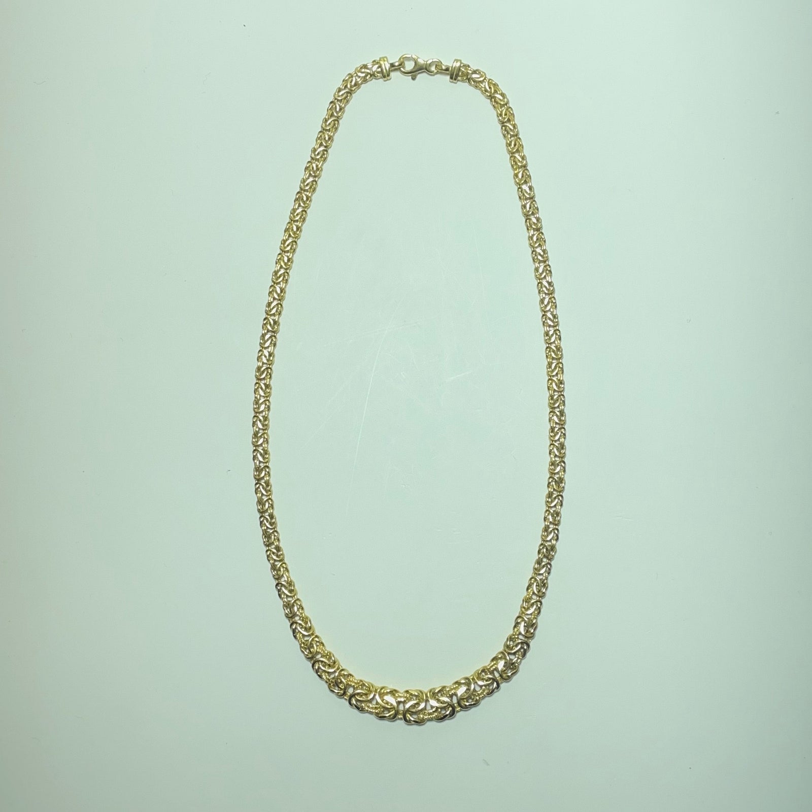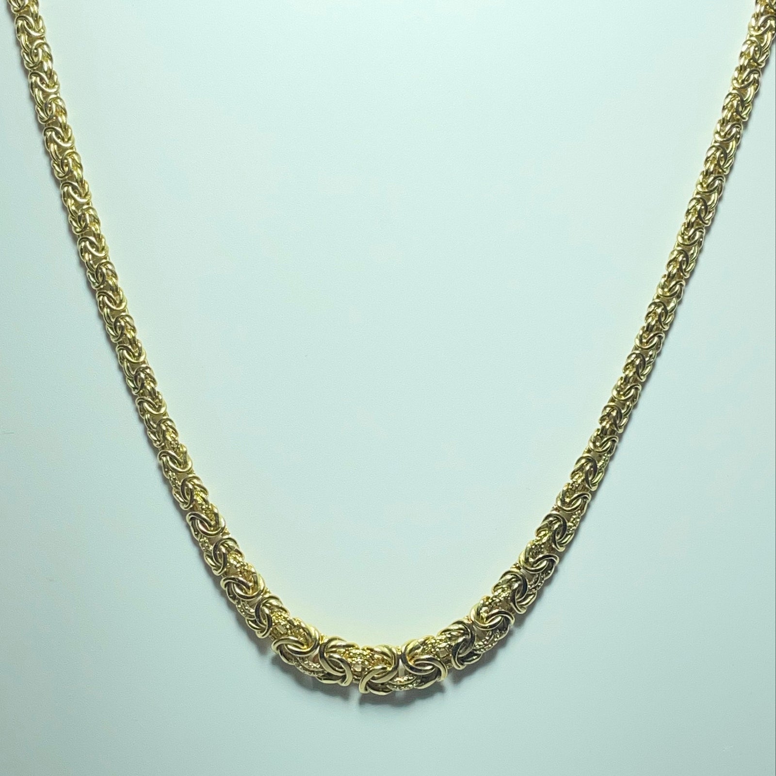 Affirmez votre style avec ce collier en maille Byzantine, une maille emblématique reconnue pour sa complexité artisanale et son rendu à la fois puissant et raffiné. Réalisé en or jaune 18 carats (750/1000), ce collier séduit par l’entrelacement sophistiqué de ses maillons, offrant une texture riche et un éclat remarquable à chaque mouvement.