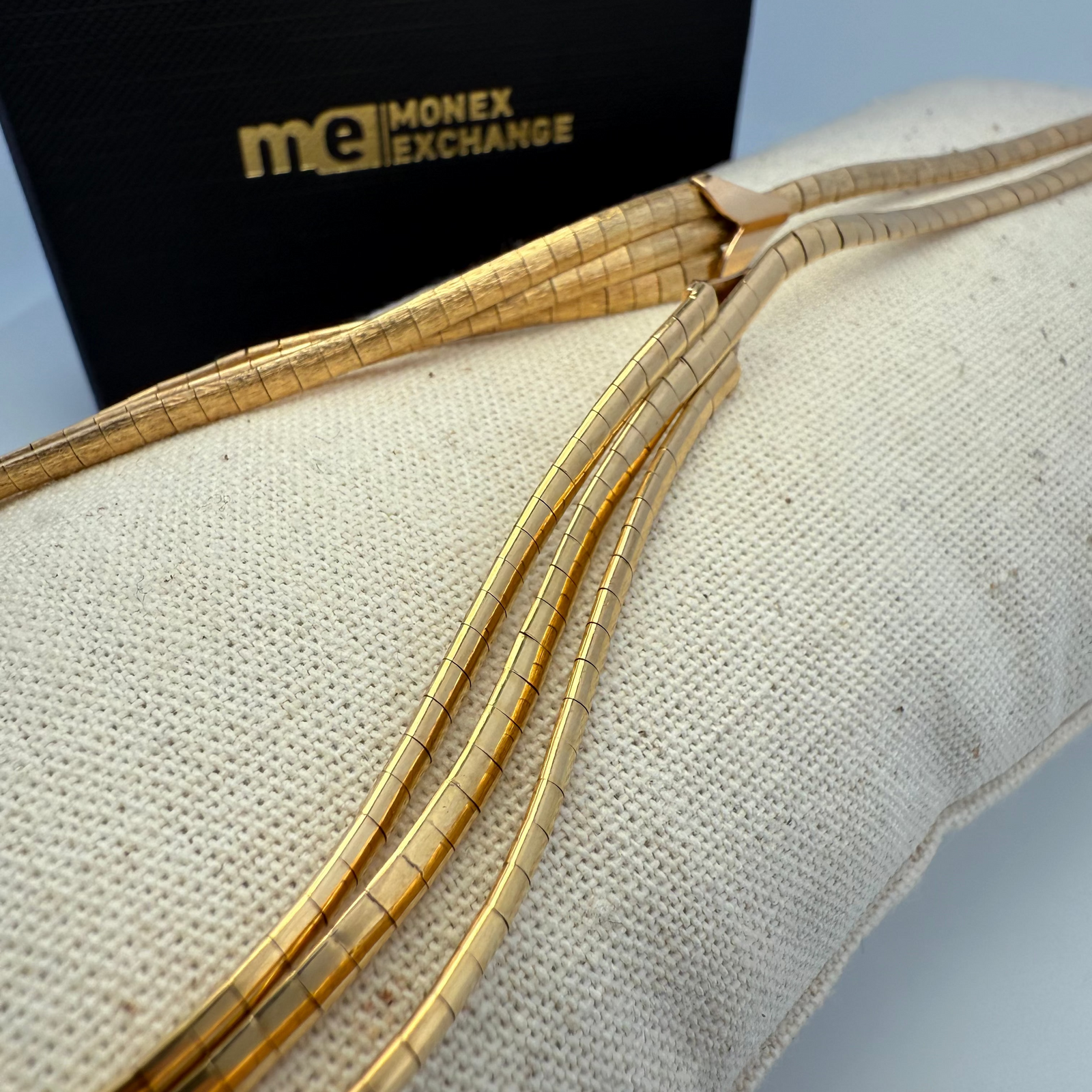 Pièce d’exception, ce collier en or jaune 18 carats (750/1000) au design triple rangs incarne le luxe et la sophistication. Sa finition lisse et brillante capte la lumière à chaque mouvement, offrant un éclat incomparable.