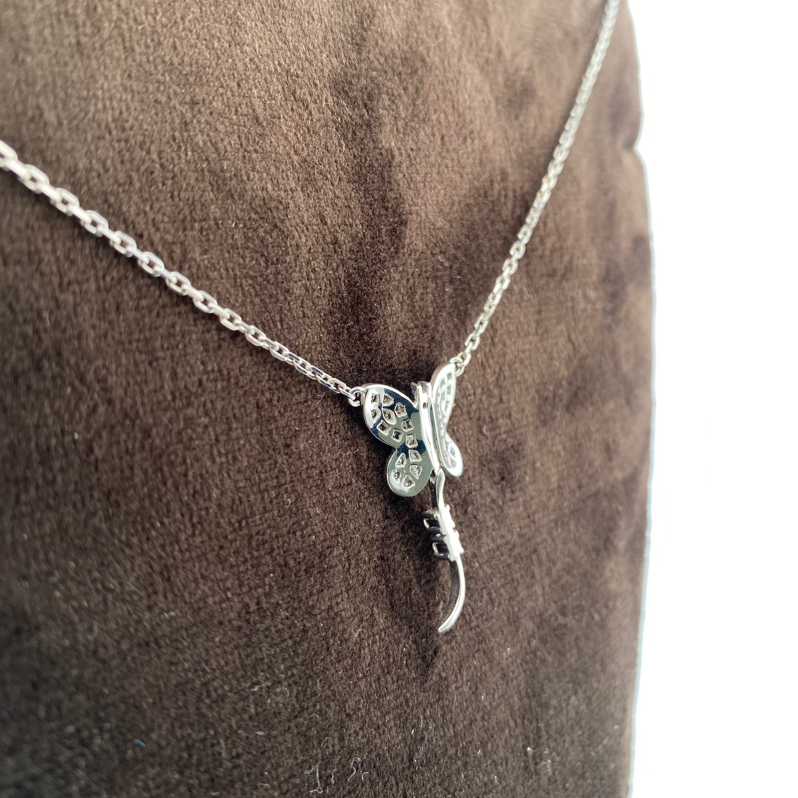 Ce collier raffiné en or blanc 18 carats (750/1000) incarne la grâce et la légèreté du papillon. Sertie de 31 diamants étincelants pour un total de 0,33 carat, cette création délicate associe poésie et éclat intemporel.